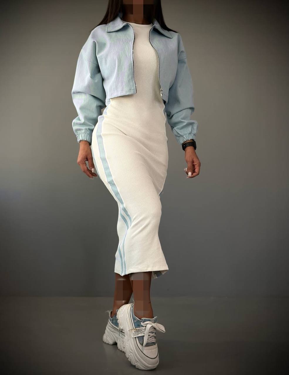 ست دو تیکه سارافون کش بافت و کت جین زنانه