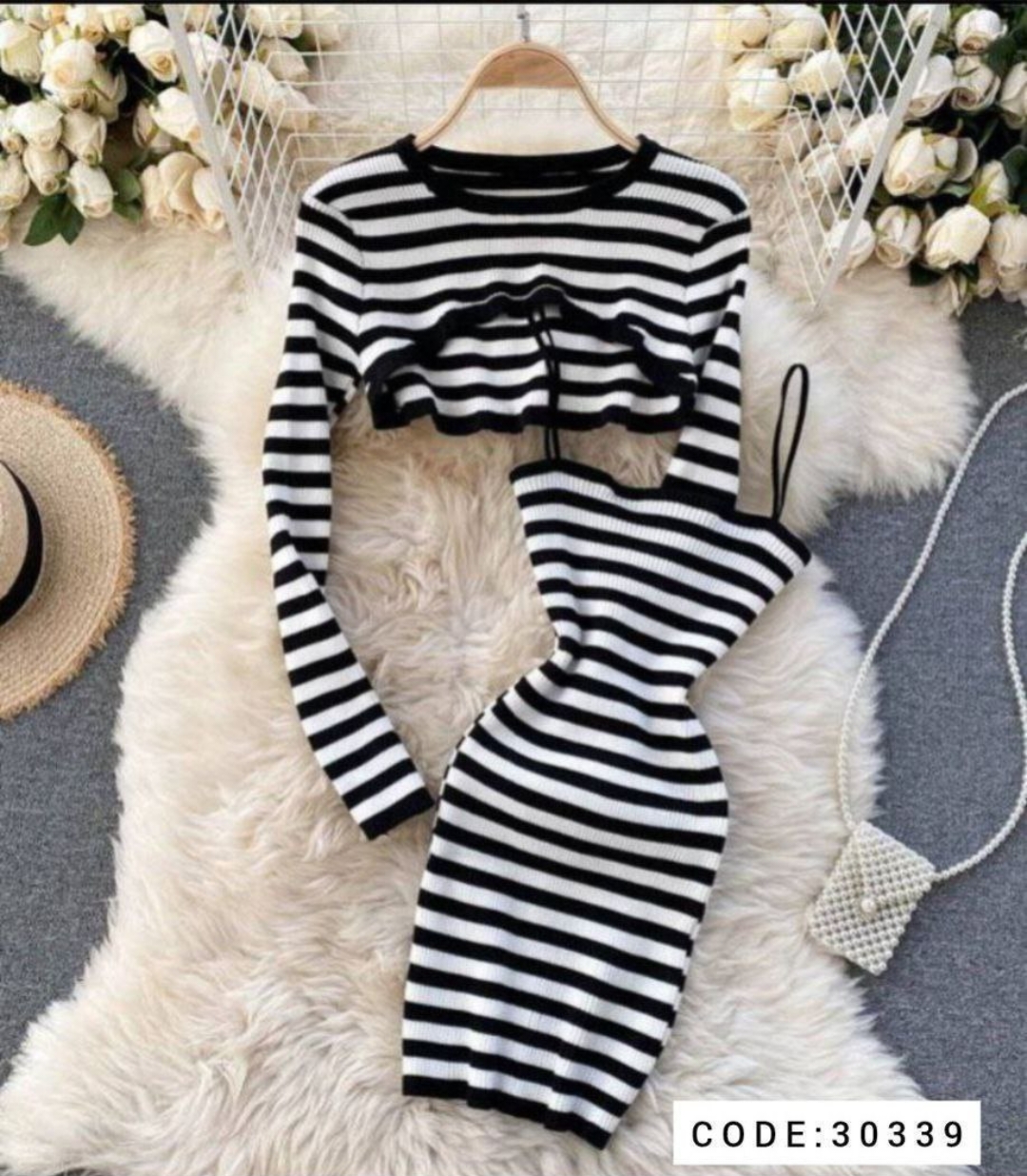 ست دو تیکه کراپ و پیراهن بندی راه راه کد 30339